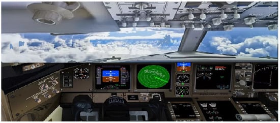 An extensive sample of students who used a VR-based flight simulator as a component of an ongoing evaluation were monitored in a study by a researcher, and the results yielded insightful information. According to preliminary findings, 70% of learners said that utilising virtual reality gear enhanced their educational achievements during the module, and every learner said virtual reality provided an additional immersive environment for learning. The results of this study highlight the prospective advantages that incorporating virtual reality glasses into technical curricula could have for improving learner participation and fostering the development of practical abilities in immersive simulations. Two students accordingly assumed the roles of pilot and co-pilot to replicate lifelike cockpit situations. The lab uses high-end controls (stick, throttle, and rudder pedals represented by a mouse) to give the pilot a genuine haptic sensation. The human pilot may steer the plane, change thrust, open the flaps to adjust the aircraft, and turn on the autopilot using the controls. They view a separate screen that displays the pilot’s views of the surroundings and cabin within the classic flying simulator without virtual reality. The pilot can only look around using the mouse since the scene is fixed [38]. The co-pilot’s area, featuring a separate display with a replica of the cockpit monitoring panel, is further depicted in Figure 3 below.