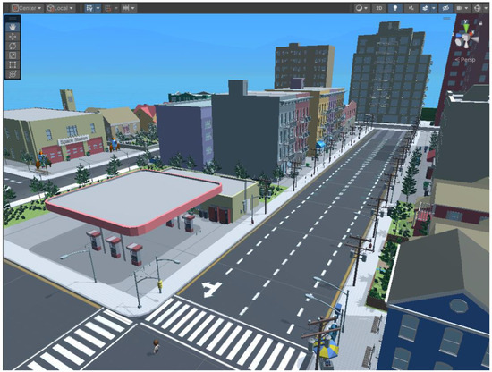 In the design and implementation of the game map, a package was used to quickly and efficiently place and edit the map to our needs (https://assetstore.unity.com/packages/3d/environments/urban/city-package-107224 (accessed on 5 August 2024)). We tweaked and changed parts of the pre-set map that was offered, including changing buildings to suit our theme, removing parts of the map, adding a hard border around it so the player cannot leave it, and adding colliders where necessary to allow for the transition to AR scenes. Figure 2 shows the overall design and look of the map. The low-poly style is intended to fit in with the cartoon style design that many games adopt for our demographic. Moreover, the colourful buildings and large open roads and spaces allow the users to easily understand the map, providing easy and visually pleasing navigation throughout the game. The AR application overlays virtual content in the real world through the device’s camera, but the quiz part is in 2D and does not use augmented overlays; this is a supplementary feature to enhance interaction without using AR. This combination of AR overlays and supportive 2D elements is designed to ensure a cohesive user experience within an augmented environment.