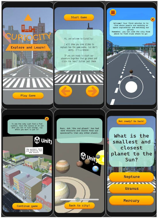 Augmented reality (AR) has garnered significant attention in educational research due to its potential to enhance learning experiences. AR technology offers an innovative approach to interactive education by employing virtual content and dynamic interfaces. CurioCity is an AR-based educational game that aims to enhance learning experiences by combining formal education and recreational games. The game was developed for smartphones and tablets, allowing users to interact with virtual content and dynamic interfaces in real-world environments. The game design is based on the principles of intuitive learning, which emphasise curiosity, exploration, and discovery. The game also incorporates gamification elements, such as challenges, rewards, and feedback, to increase user engagement and motivation. CurioCity serves as a proof-of-concept and a preliminary investigation into the future possibilities of AR in educational game settings. Through user testing and surveys, the project evaluates the game’s usability, user satisfaction, and learning outcomes. The initial usability results with expert users show that CurioCity is an effective and enjoyable educational tool that can foster learning outcomes and user engagement. The project also provides insights and recommendations for future research and development.