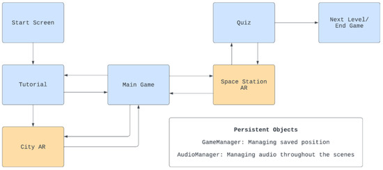A diagram demonstrating the flow of the game. AR scenes are in orange and non-AR scenes are in blue.