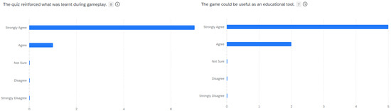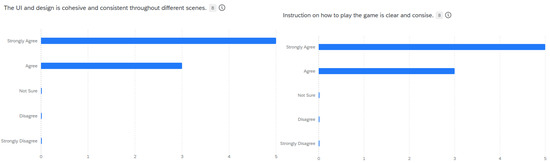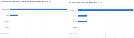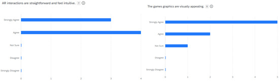 The tests were conducted with eight participants between the ages of 21 and 28, using an Android build of the game on a Samsung Galaxy S22. These participants were chosen to test the usability and quality of the application, not to evaluate the outcomes. The tests were conducted in different indoor environments, a large booth with a large open table, a smaller enclosed area with a small table, and a floor. This was to investigate if the AR features were equally effective on different surfaces and in different space confinements. None of the participants had any substantial experience with AR, which helped to slightly balance the difference in age against the target demographic. The participants were briefed about the game, being an AR educational game for children aged 4+. No tasks were assigned; instead, they were asked to load and play the game as they naturally would. The rationale behind this was to test how easy the game was to play and how intuitive the controls and interactions were. The game provides instruction throughout, and it is essential that they are clear and concise. The participants took around 5 min to play through the game, after which they were asked to fill out an anonymous survey containing eight questions with space for feedback at the end. The questions were designed to gauge the participants’ experience with the game instructions, the intuitiveness of the AR interactions, the performance of the game, and its educational relevance. The results of the questionnaires are presented in Figure 5, Figure 6, Figure 7 and Figure 8.