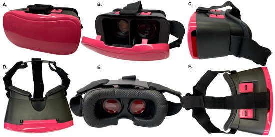 Image of a virtual reality headset. To use the headset, one flips open the pink door of the headset, inserts a device that has the media displayed on the screen of the device, closes the door, and then places the headset on their head. The top of the headset has specific features that allow for the lenses to be adjusted closer or further from the viewer’s eyes and from side to side to allow for optimal viewing. (A–F) Various views of the headset.