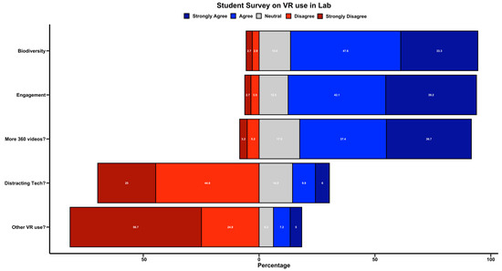When analyzing the data from our survey, we found that students had a positive experience with VR in the lab. From enhancing engagement with specific topics to better visualizing global biodiversity, students agreed that the experience was beneficial (Figure 2). We even assessed students’ views on implementing more VR experiences in the lab, and they were enthusiastically in favor, with 74.1% of students either strongly agreeing or agreeing (Figure 2). Previous studies have shown that technology use and potential motion sickness may occur and result in undesirable VR experiences for students/users in general [25]. To help address the technology aspects, we asked students if technology distracted them from the topic, and 69.6% of students either disagreed or strongly disagreed (Figure 2). While students were enthusiastic about VR experiences in the lab, our survey results suggest that it is not something they have encountered in many other courses (81.6% either disagreed or strongly disagreed with the question “I have used 360-degree videos/virtual reality in other courses”). Overall, the reception of the VR experience by students was extremely positive and was praised by the instructor, which may have helped students engage fully (engagement helps students meet their academic goals) [20,29,30].