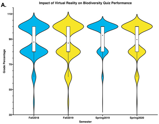We also analyzed student performance on a formative quiz focused on the topic of plant biology. Traditionally, students have found the plant material of the course to be unengaging. As shown in Figure 5, we analyzed the plant quiz performance in semesters with and without VR experiences. VR experiences were associated with a significant increase in quiz performance (averages for quizzes: Fall 2018: 86.18%, Fall 2019: 92.03%, Spring 2019: 87.81%, and Spring 2020: 94.59%). The distribution of the quiz grades was different between semesters with and without the use of VR, with an increase in grade percentage (Figure 5A). Statistical significance was determined by performing a Mann–Whitney U Test, with a significant increase found in grades from Fall 2018 to Fall 2019 and from Spring 2019 to Spring 2020 (fall data: p-value: 1.43 × 10−10, Z-test statistic: −6.43, U: 75,802.5; spring data: p-value: 1.4 × 10−30, Z test statistic: −10.6, U: 237,917).