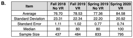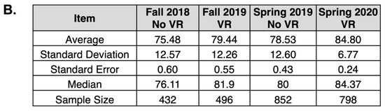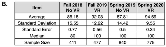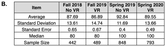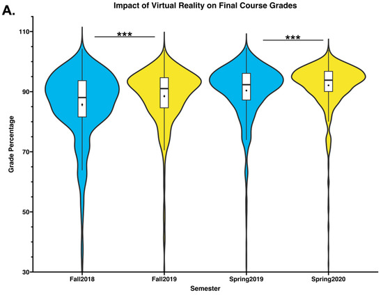 Then, to analyze potential impacts on final course grades, we compared semesters with and without VR usage (Figure 7). Here, we uncovered that both fall and spring semesters had a statistically significant increase in student grades in semesters that had a VR experience than in semesters without a VR experience. While several factors could potentially influence final course grades, including admission standard changes or advisement changes, VR experiences had a positive impact on student course grades and engagement, as has been found in other studies using VR in education [11,14,28,33].