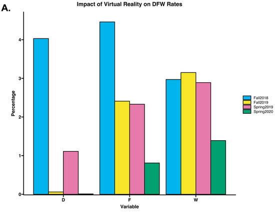 Lastly, we assessed the D, F, and withdrawal rates (Figure 8). Rates of D and F grades were significantly lower in semesters that implemented VR experiences. Fall semester withdrawal rates were not significantly altered, while there was an associated decrease in withdrawal rates for the spring semester. While these results are encouraging, it should be noted that, specifically for withdrawal rates, the spring semester did experience a shutdown due to the global pandemic and a shift to virtual learning.