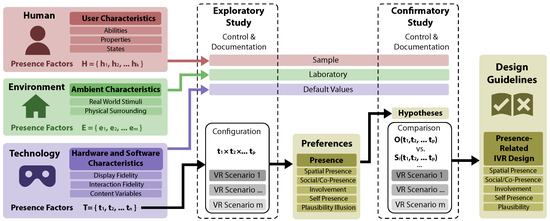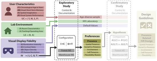 In this work, we develop a methodology of systematic investigation with the goal of making presence factors controllable. Internal factors can only be controlled through the purposeful recruitment of participants and rigorous documentation of user characteristics. However, this entails the risk of excluding certain user groups based on cognitive, perceptive, and motor abilities. As characteristics of the IVR system, external factors are the only ones that can be controlled by technological means. When investigating external factors, confirmatory studies (testing hypotheses) are the de facto standard. Typically, these studies compare different versions of an IVE [20,21,22], or entirely different IVR applications [23,24,25] addressing one or several specific presence factors. Studies that utilize exploratory approaches, which allow for a more open investigation of presence determinants, remain scarce (e.g., individual configurability [26,27,28]). As mentioned, confirmatory presence studies often lead to contradictory results (e.g., for factors such as display resolution [18], polygon count [29,30,31], emotion [32,33], VR scenario [34,35,36], and age [37,38,39]). In addition, it is hard to isolate the effect that singular factors may have on presence, since they often manipulate a conglomerate of factors within their experimental conditions. A common example is manipulating both display and interaction characteristics in one condition change [40,41,42,43,44,45]. This also complicates the identification of dependencies and interactions between factors.