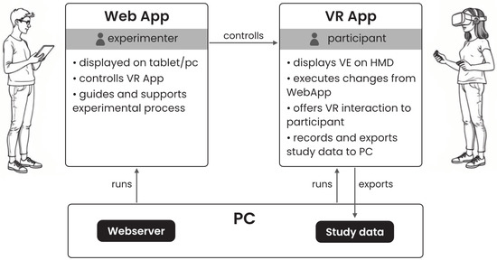 Two component architectures of the developed IVR study tool. The web app (left) serves as an experimenter interface by controlling the IVR app (right) that displays the VE and enables VR interaction. Both were executed locally on a laboratory PC (bottom).