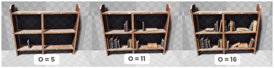 To support the creation of adaptable scenarios, a series of systems were implemented using the Blueprint system provided by the Unreal Engine (https://dev.epicgames.com/documentation/en-us/unreal-engine/introduction-to-blueprints-visual-scripting-in-unreal-engine?application_version=5.0, accessed on 30 May 2025). The manipulation of IVs (which are referred to as Adaptation Dimensions (ADs) within the tool) is handled by the Adaptation Dimension Manager (ADManager). This is achieved through direct control of the player camera contrast (C), scaling the intensity of all light sources (I), toggling the visibility of objects (O), or the execution of console commands to manipulate the resolution of all textures (T) in the scene (https://developer.arm.com/documentation/102696/0100/Texture-mipmapping, accessed on 30 May 2025). The latter was implemented by extending the existing Unreal Engine construct of the Actor, creating the so-called Adaptation Dimension Actor (ADActor), which allows for the systematic manipulation of this Actor’s visibility. When an ADActor is placed in the scene, it is randomly determined at which degree of the AD (O) it becomes visible. At the maximum degree of O, all ADActors are visible. To address more complex object compositions, e.g., involving gravity (objects placed on top of each other), the ADComplexActor was created as an extension to the ADActor. It allows the developer to group multiple objects together and predetermine a specific order in which the individual objects appear (with the range of AD (O) degrees still being determined randomly). Figure 3 shows a bookshelf implemented as a ComplexADActor. In this example, at the AD degree of (left), there is only one book visible; with each degree more books are added, and these can lay or lean on previous books (middle). At the degree of 16, all books are visible (right).