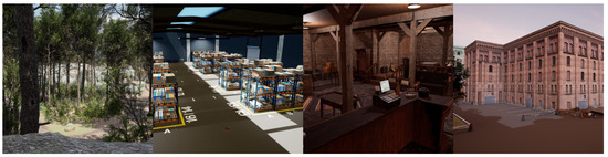 Adaptive IVEs developed in the scope of the study system (from left to right: forest, warehouse, antique shop, urban).