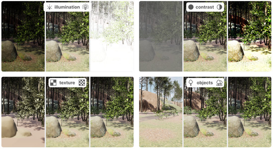 Forest IVE: different IV configurations on low, medium, and high levels; illumination intensity (top-left); contrast ratio (top-right); texture resolution (bottom-left); object density (bottom-right). Each IV can be configured on a scale from 0 to 16.