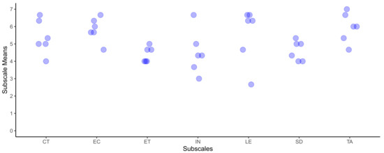 Strip plot of all subscales of the ISONORM 9241/110-S usability questionnaire from the formative expert evaluation. CT = controllability, EC = expectation conformity, ET = error tolerance, IN = individualizability, LE = learnability, SD = self-descriptiveness, TA = task appropriateness.