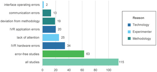 All 115 participants successfully completed the exploratory study process, despite 84% of participants having little or no IVR experience (55% were novice users). This means that all participants understood how to configure the IV in the IVR scenario and how to find and collect the task objects in the IVE. Then, 63 of the studies did not encounter any problems during the study procedure. The remaining 52 studies encountered problems that can by classified as technological errors, errors by the experimenter, and errors relating to the methodology (see Figure 9). In terms of technological errors, malfunctioning of the IVR software, i.e., the Unreal Engine application (see Section 5.1.1) occurred in 20 studies. This included unforeseen crashes of the application, physics glitches in task objects, and the teleport locomotion not working properly. Malfunctions in the IVR hardware occurred in 34 studies, specifically non-functioning controllers and blackscreens within the HMD, due to loose or damaged cable connections (as the material was heavily stressed by over 400 IVR exposures in total). Errors by the experimenter can be attributed to a lack of attention (25), such as forgetting to turn on the controllers before the experiment, or to plug the headphones into the HMD, or incorrect operations in the experimenter interface (2), such as incrementing/decrementing an IV by mistake and accidentally loading the next IVR scenario. In terms of methodology, communication errors between the experimenter and participant occurred in 13 studies, as task instructions or term definitions (i.e., presence) appeared to have been ambiguous since they were not correctly understood. Furthermore, the methodological requirements could not be met in 19 studies, as the experimenter sometimes had to give additional information for solving the search task or had to physically intervene (restart the controller, adjust the HMD/cable), or the experimenter’s voice led to a break in presence for some participants.
