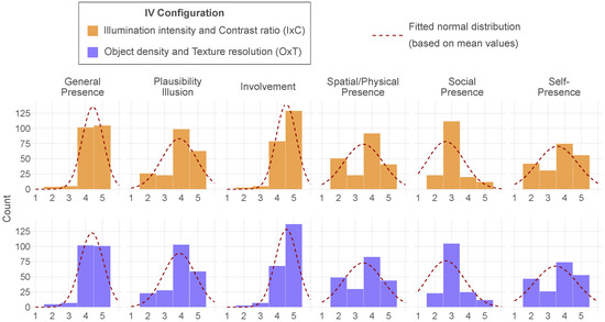 Histograms of the post hoc presence ratings (all subcomponents) of the IVR task after the IV configuration (either illumination intensity and contrast ratio (top) or object density and texture resolution (bottom), measured by the presence short scale (see Appendix B, Table A1).