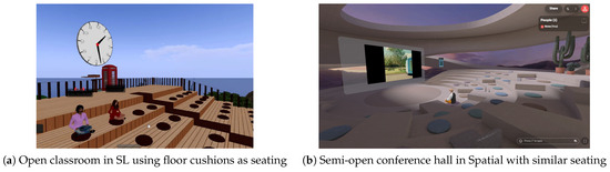 In online learning environments, establishing a sense of place presents challenges yet remains essential for educational experiences [28]. These environments influence where, how, and what students learn, similar to how designers create physical spaces for multiple uses [29]. In such places, education shifts from information transfer toward designing students’ experiences and contexts for learning activities, creating a trend toward enriched learning experiences using active, exploratory, and experiential methodologies rather than passive knowledge acquisition approaches [30]. Architectural design metaphors play a crucial role in this transformation, providing familiar spatial frameworks that help users navigate and understand virtual environments, thereby facilitating the place-making process essential for virtual learning.