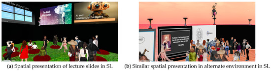The persistence of educational communities in platforms like SL, despite newer technological alternatives, demonstrates that the sense of community in spatial virtual environments offers additional educational advantages. Consequently, we identified community as a crucial third dimension that operates synergistically with presence and place within our research framework. To establish the scope of our investigation into these three dimensions, we focused on DVWs rather than immersive virtual reality (VR) environments because DVWs represent the most available and widely adopted form of virtual world education. DVWs provide crucial advantages for educational contexts including operation on standard computing equipment that students already have access to and are familiar with, extended learning sessions without physical discomfort, convenient integration with other digital learning tools, and superior support for sustained engagement and community building. While immersive VR may offer advantages for applications requiring high-fidelity spatial manipulation or embodied skill training, most educational contexts benefit more from DVWs’ practical affordances. This aligns with empirical evidence from Marks and Thomas [7], who found that despite 71.5% of students reporting VR enhanced learning outcomes, 36.3% experienced physical discomfort, highlighting barriers to sustained educational use.