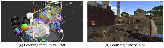 Many DVWs provide content creation affordances. These platforms offer libraries of preset geometric objects that can be combined, manipulated, and customized to build desired environments and models [78]. Advanced affordances include lighting settings, texture application, sound integration, and interactive programming. These creation affordances facilitate building learning communities through students’ shared creative work. As Dickey [70] emphasizes, collaborative participation in creating virtual learning environments strengthens social bonds within classes. This collaborative design process strengthens students’ capacity to externalize knowledge, develop ownership, and engage actively with peers, enhancing problem-solving skills and deepening conceptual understanding [79].