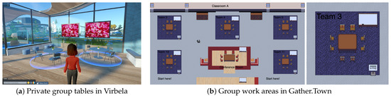 Other significant affordances of DVWs are related to communication. Communication affordances form the foundation of social learning in virtual environments, enabling students to share ideas, collaborate on projects, and build communities [85]. Providing learners with the means to interact with one another and with instructors represents a crucial aspect of learning environments. These communication affordances support collaborative learning, teamwork, and socialization through peer exchange [86]. DVWs offer enhanced computer-supported collaborative environments where embodied social presence makes remote interactions more similar to in-person engagement [87]. To facilitate this presence, DVWs implement various design elements promoting collaboration, such as group-specific avatar outfits or designated team spaces [88].