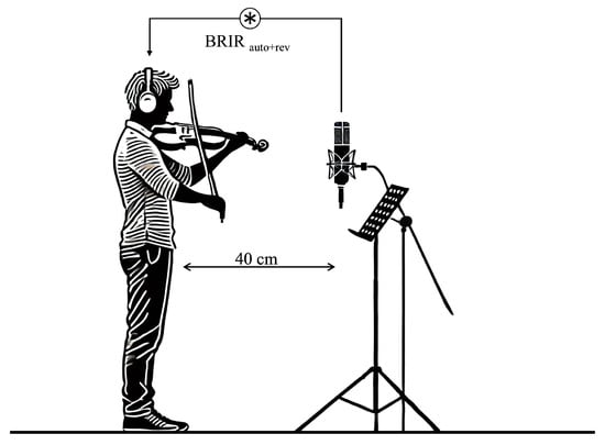 The signal of the microphone was forwarded for convolution to a real-time digital audio signal processing application (Cycling’74 Max 8, San Francisco, CA, USA) using an audio interface (RME Fireface UCX, Haimhausen, Germany). Convolution was performed using the RoomZ VST plugin [32], a low-latency multichannel partitioned convolution engine. The result was rendered through the sound card to an amplifier that powered a pair of open headphones (AKG K1000, Northridge, CA, USA), or headspeakers. Using completely open headphones was considered necessary so as not to affect the direct sound perceived by the musician of their instrument. Previous studies have shown that these headphones are sufficiently acoustically transparent for musicians to hear their natural direct sound without attenuation or coloration artefacts [7,31,33,34].