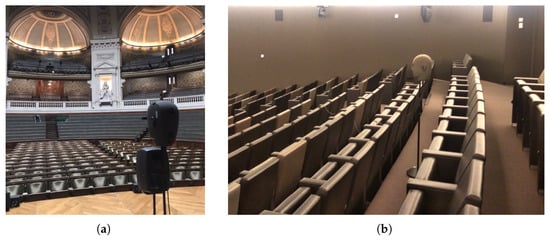 Photos of measurement sessions. (a) Grand Amphitheatre, autophonous configuration. (b) Auditorium, configuration with the source on the stage and the receiver at the back of the room.