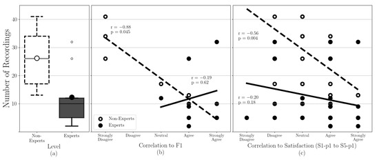 Statistical analysis of participants’ responses was performed using a multi-factor analysis of variance (ANOVA) in RStudio (version 2021.09.0). The factors identified were the group (, , and ), the phase (Phase 1 rehearsal and Phase 2.2 performance), and the expertise level (expert and non-expert). Post-hoc pairwise comparisons for significant factors were made with Tukey–Kramer adjusted p-values. For all tests, statistical significance was determined for p-values below a threshold. Due to the relatively small number of participants and the study’s exploratory nature, results with a p-value of less than 0.1 are reported as trends. Effect size metrics, Cohen’s d and values, are reported where appropriate. The notation is adopted to indicate p-values below .
