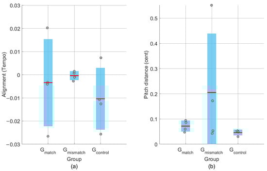A dynamic time warping (DTW function, Matlab) algorithm was applied to the fundamental frequency arrays to align performances of Phases 1 & 2. The alignment was calculated as the difference between the number of gaps added in the Phase 2.2 recording and the number of gaps added in the Phase 2.1 recording to achieve optimal alignment. This score is closely related to overall duration and, therefore, tempo of the performed musical passage. A positive alignment score indicates that more gaps were added in Phase 2.2 than in Phase 2.1, suggesting a generally faster tempo in Phase 2.2. Once aligned, pitch sequences were compared note by note, and the mean absolute pitch difference in cents between the two performances was calculated. Alignment metrics and mean absolute peach differences have been normalized by the duration of performance by participant.