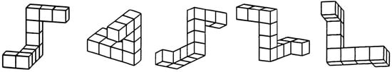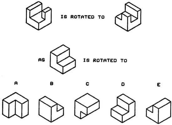 The most common methods to measure spatial abilities are mental rotation tests, the measurement of which became popular in the 1970s [33,34,35], especially the speed of mental rotation. There are numerous variations of these tests. Figure 2 (the Mental Rotation Test (MR)) and Figure 3 (the Purdue Spatial Visualization Tests: Visualization of Rotations (PSVT:R)) present two frequent examples. In Figure 2 [33], there is a target figure in the left position, followed by four choice figures. The task is to indicate which two of the four choice figures are rotated reproductions of the figure on the left. The correct answers are the first and the third (starting from the left).