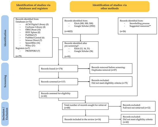 PRISMA 2020 flow diagram for new systematic reviews which included searches of databases, registers, and other sources adapted according to our research process. The original flowchart was adapted to reflect the research process followed. * pre-screening: This screening was only applied to Google Scholar (title-based screening) and Elicit (automatic screening performed by the programme). This process is fully described in Appendix C. ** suggested resources: These are the ones suggested by search engines and online platforms (e.g., Google Scholar, PubMed), which appeared as ‘related articles’ or algorithm-based recommendations.