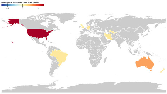 The included studies were published between 2006 and 2025, and were primarily conducted in the USA (n = 7, 50%) and Australia (n = 3, 21.4%). Despite being published in different countries, including non-English-speaking countries, all the included articles are in English (n = 14, 100%). Figure 2 shows the geographical distribution of the included studies.