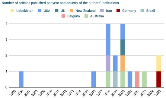 Number of articles published per year and country of the authors’ institutions. Please note: the graph’s total number of articles is higher than the included number because some studies were performed by two countries.