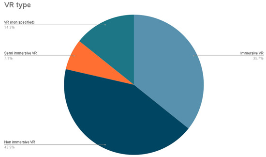 The simple categorization “VR” has been used to identify the studies in which the kind of virtual reality used was not specified. From now on, VR references will target the general use of VR, unless it is specified otherwise.