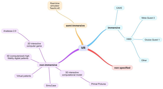 For this paper, VR has been divided into three macro categories: immersive VR, semi-immersive VR, and non-immersive VR. In this context, we refer to immersive VR when the technology is able to “surround”, i.e., through the use of head-mounted displays (HMDs) or CAVE systems [15]. On the contrary, we categorised the desktop-based VR systems as “non immersive VR” [16], which provide a lower level of immersion with respect to the immersive ones but, through the desktop, mouse, and keyboard, allow the user to interact effectively with the 3D environment represented by the 2D system. An example of this is represented by Virtual Patients. Systems that implement intermediate shades of immersiveness will be categorised as semi-immersive VR; these may include the use of larger screens to provide the user with a higher sense of presence.