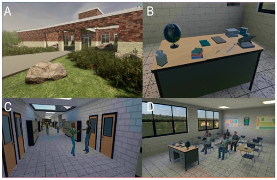 Screenshots from the vRS simulation in the following order: (A) school entrance; (B) desk in correct classroom; (C) school hallway with peers, lockers, and multiple classroom doors; (D) correct classroom with empty desks for students.