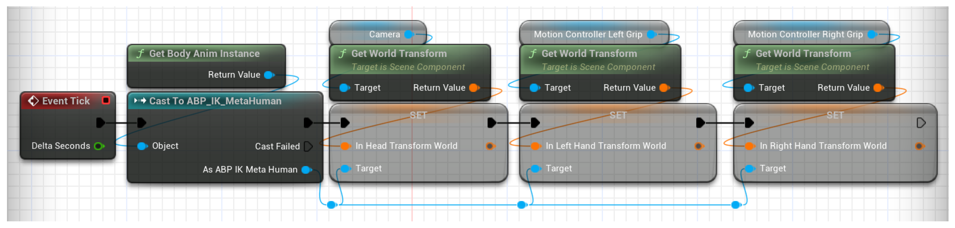 Blueprint wires the camera and left/right controller world transforms into the ABP each tick—feeding Head/Left/Right Hand inputs—so the skeletal mesh follows the HMD/controllers while UBIKSolver solves the remaining upper body.
