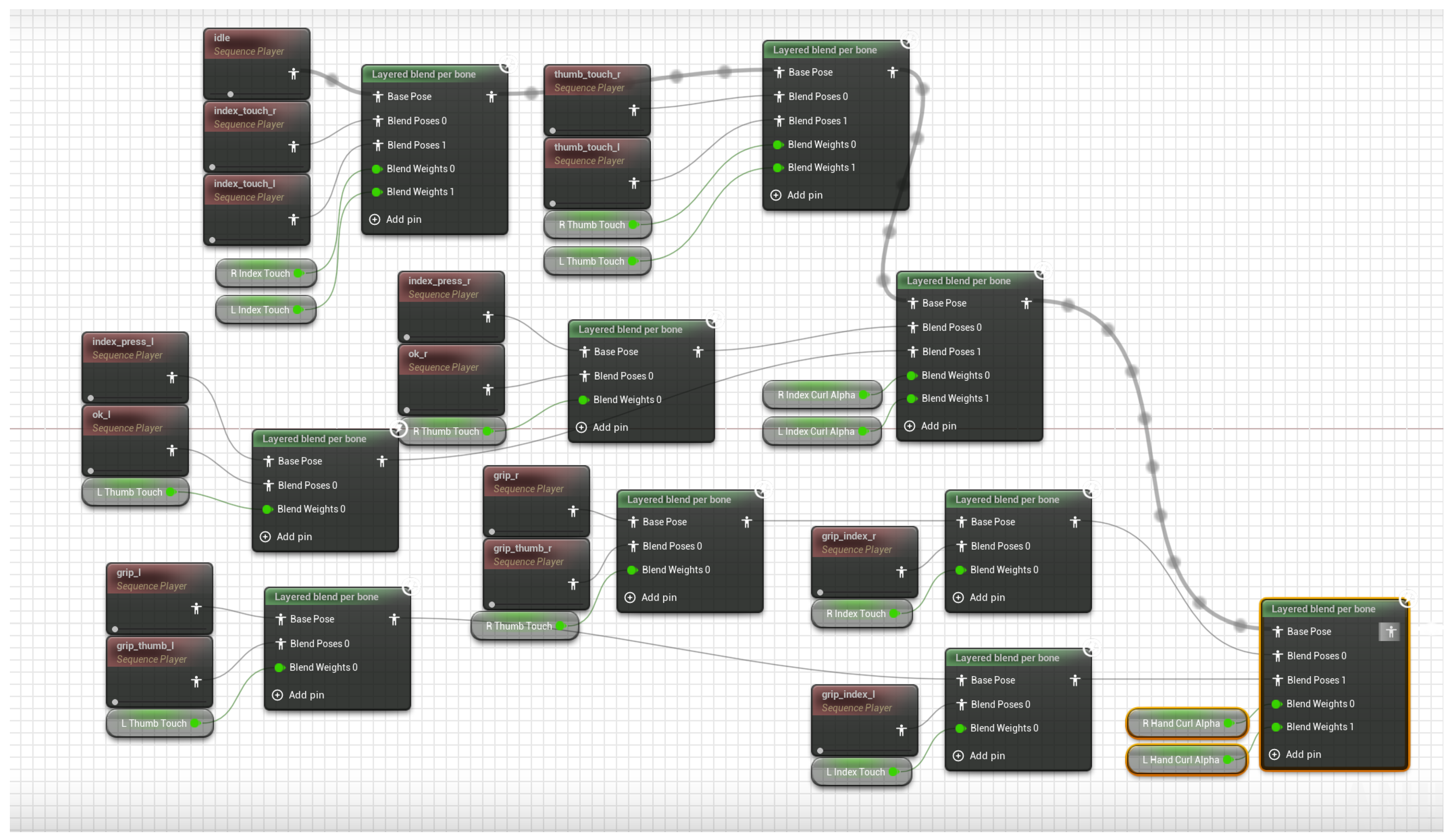 Controller inputs drive sequence poses (idle, index/thumb touch/press, grip variants) that are layered per-bone via scalar weights to compose the final hand pose before forwarding to UBIKSolver.