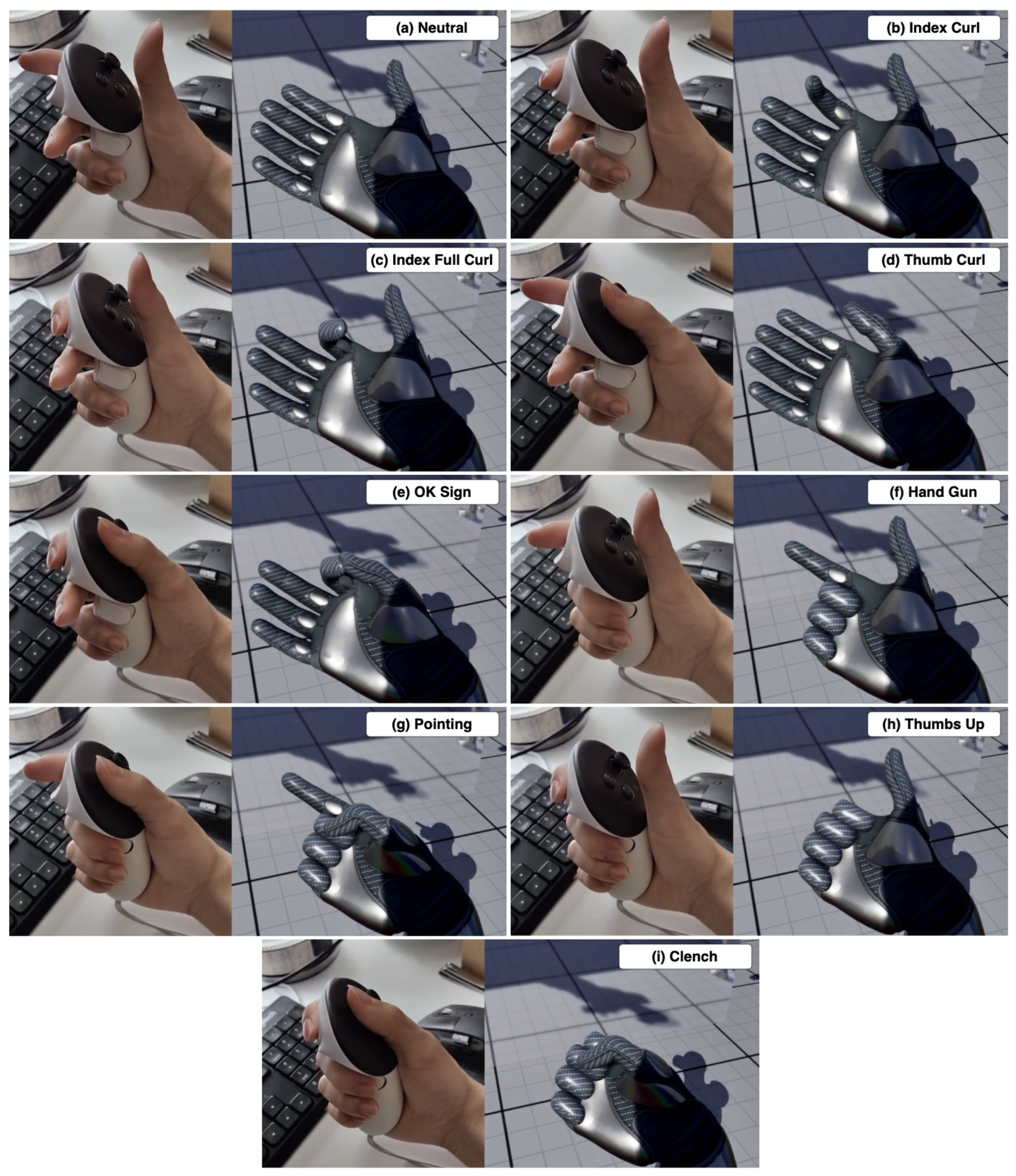 Quest controller touch/press combinations drive avatar hand poses—Neutral, Index Curl/Full Curl, OK, Hand-Gun, Pointing, Thumbs-Up, and Clench—used as discrete gestures in the evaluator.