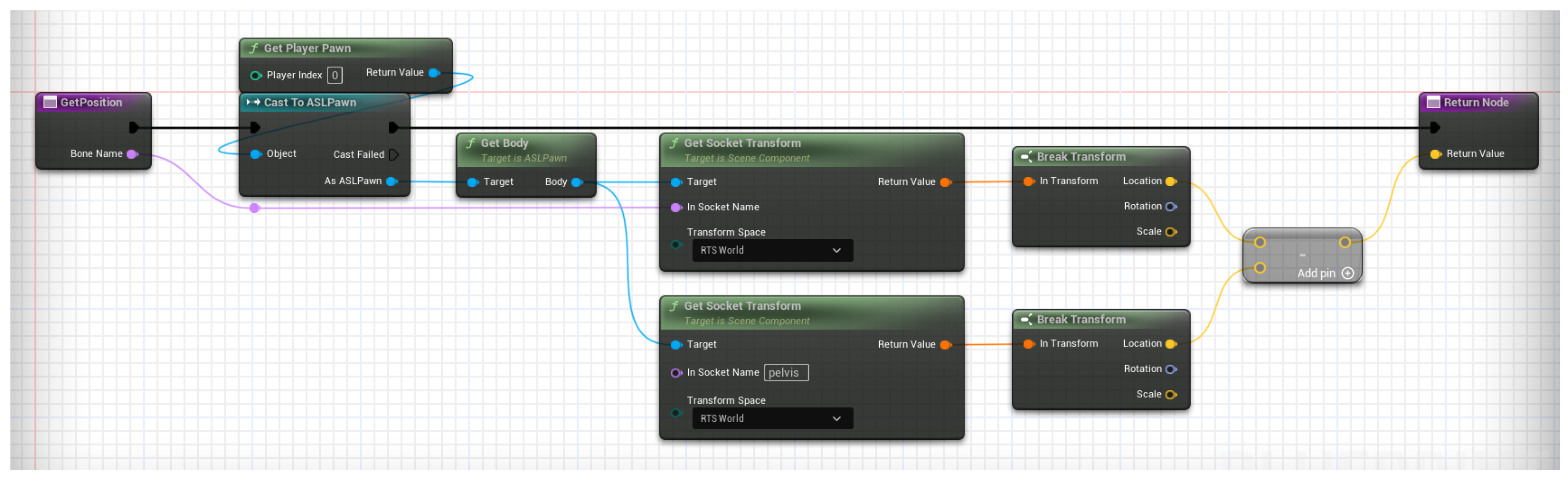 The world position of a bone is first subtracted by the world position of the pelvis bone so that the hand bone’s position is relative to the pelvis bone.