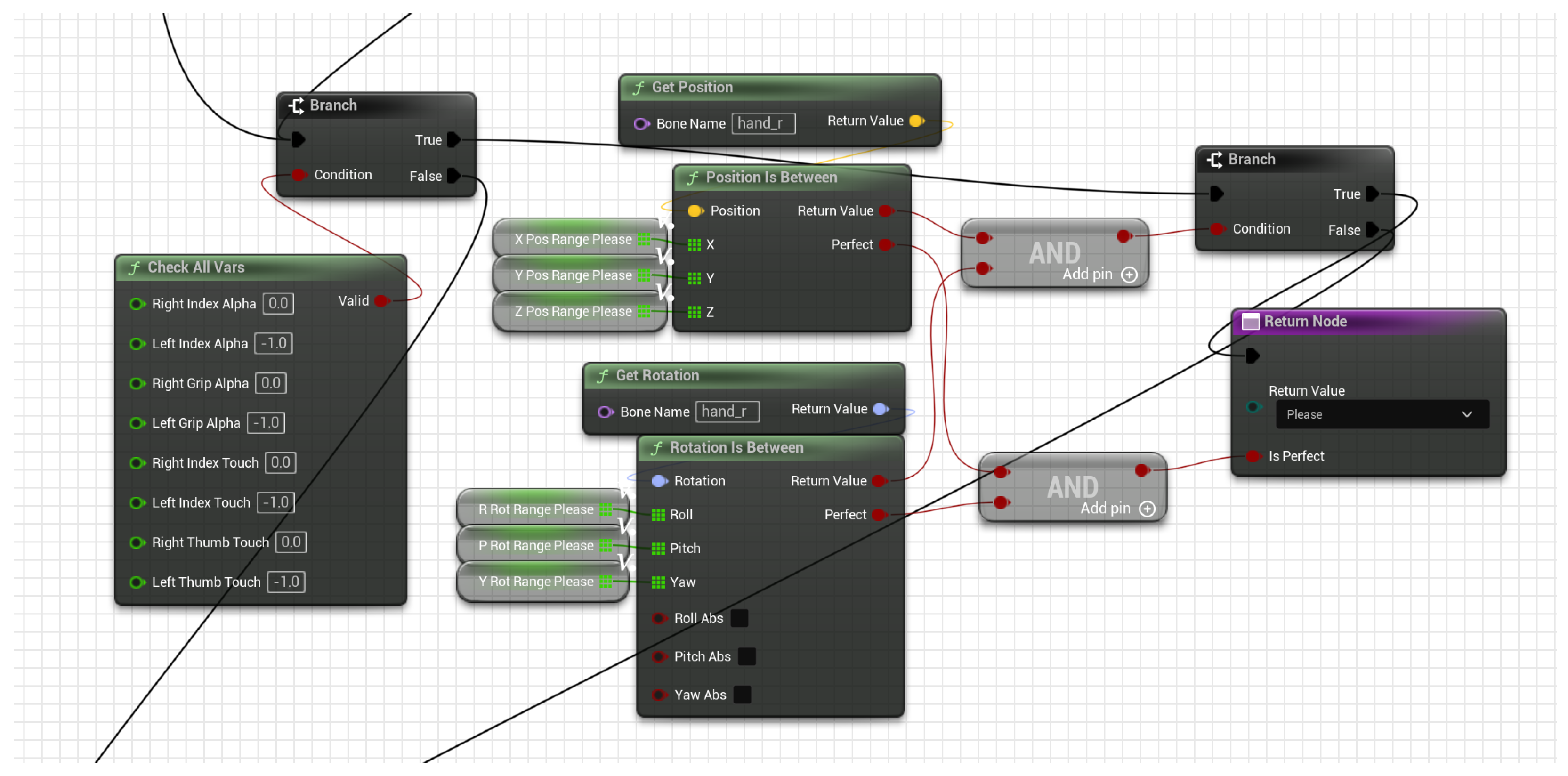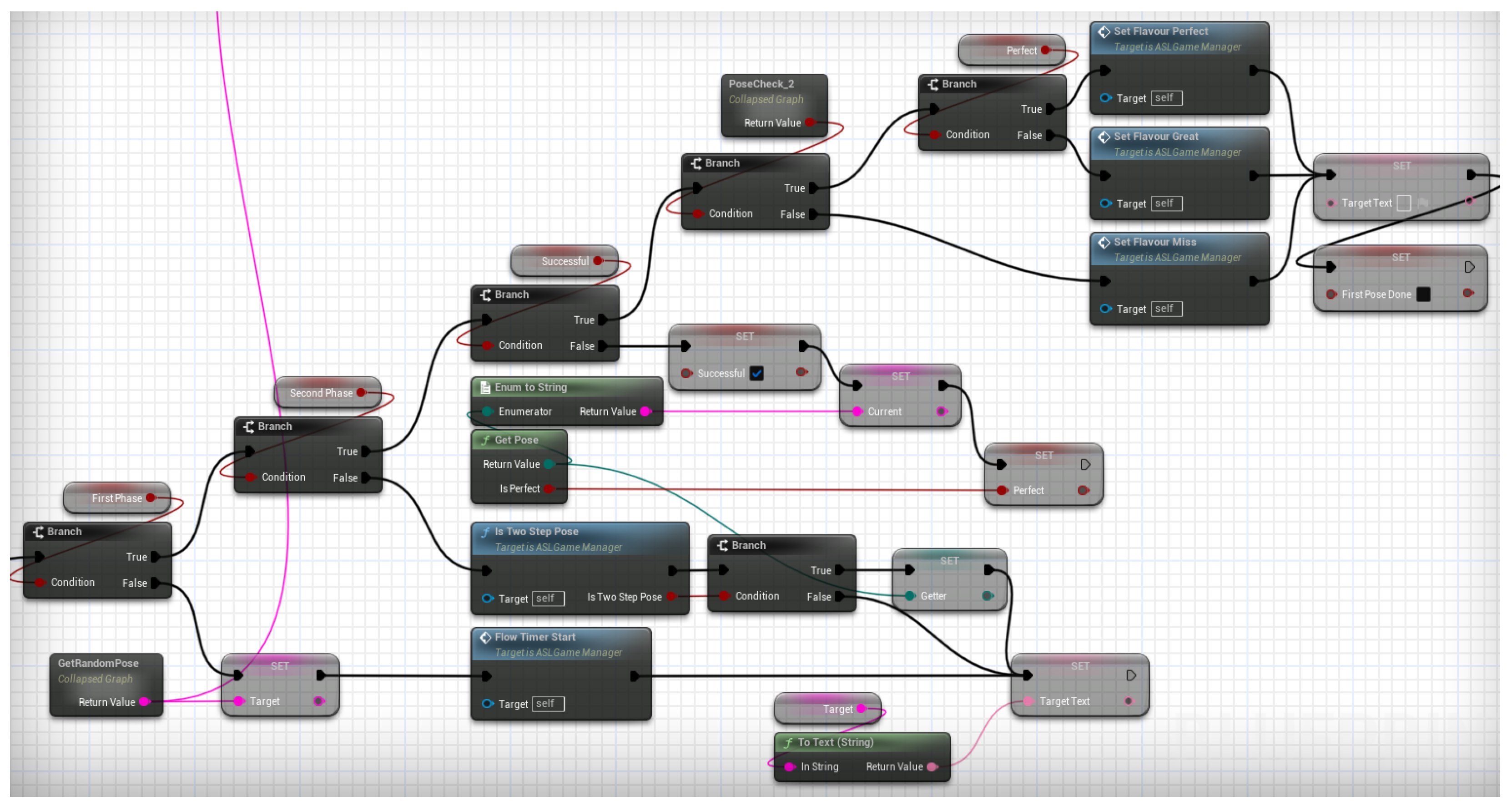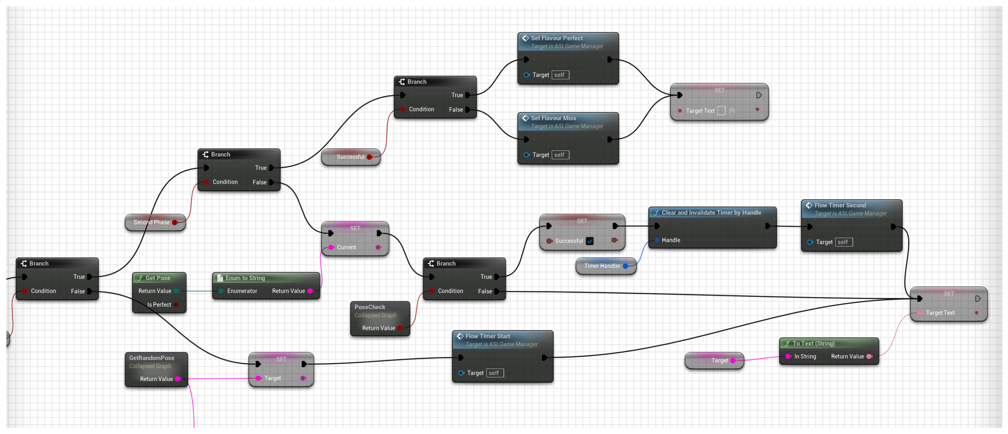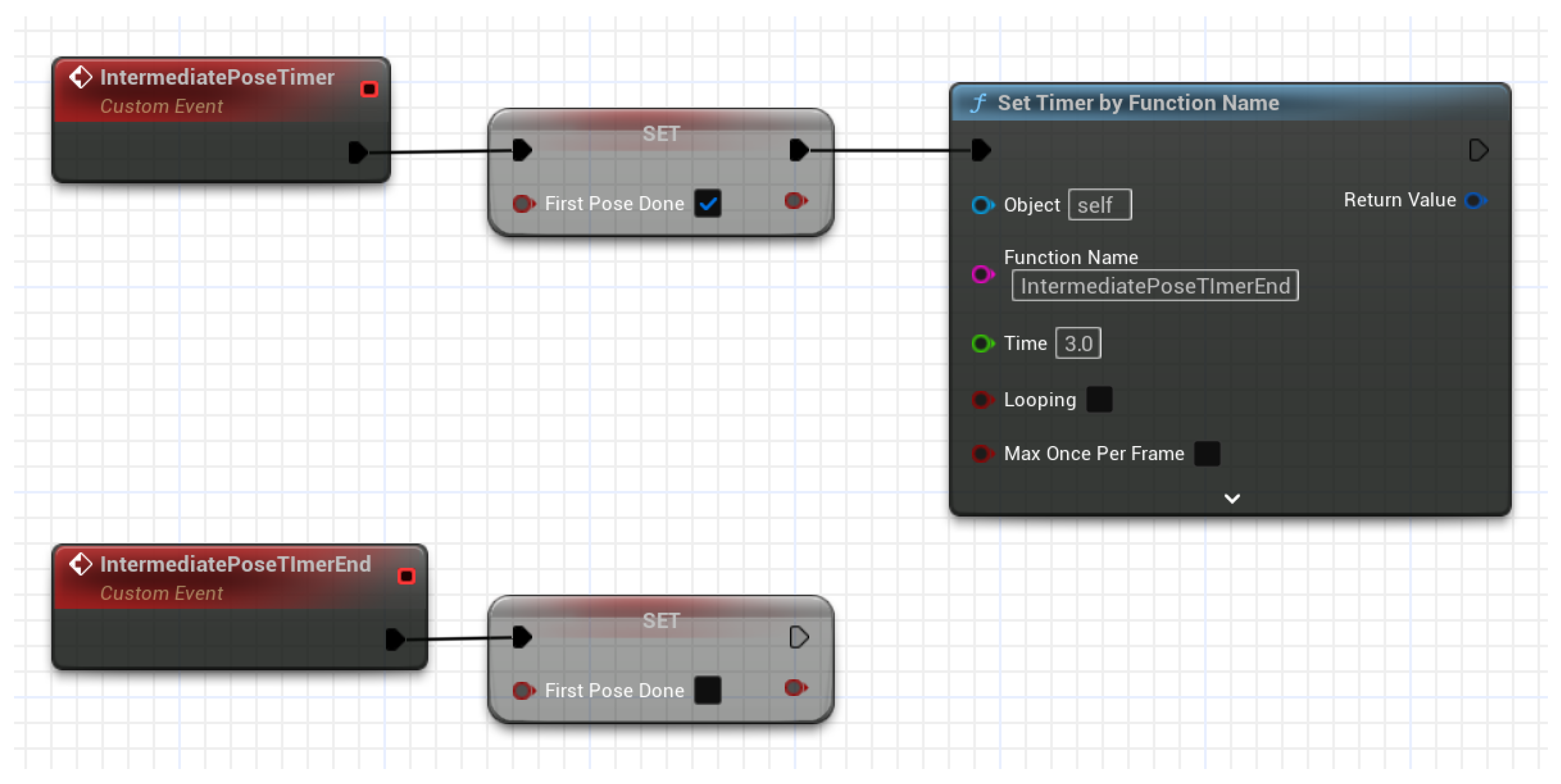 Game logic for snapshot mode. The blueprint runs a short countdown, opens a capture window, and evaluates the pose only at timeout—requiring the player to hold the prompted configuration.
