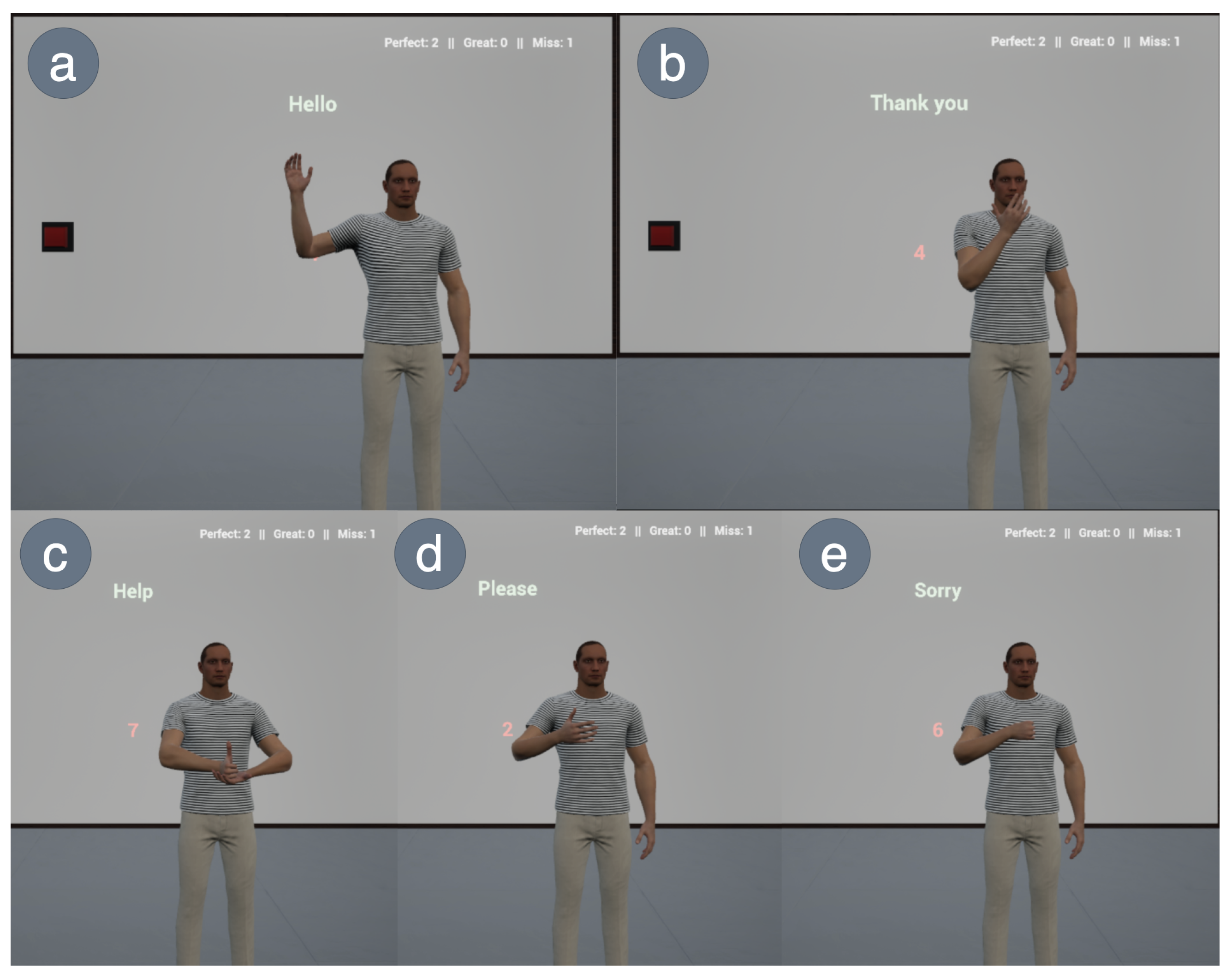 In-game look while playing. Panels (a–e) show the five supported signs performed in front of the console: (a) Hello (single-hand wave), (b) Thank you (dynamic, two-step mouth-to-out gesture), (c) Help (two-hand configuration with supporting palm), (d) Please (flat hand on chest), and (e) Sorry (circular fist on chest). The on-wall UI provides the prompt and countdown; results are computed from combined hand-gesture and position/rotation thresholds, with feedback (“Miss…/Great!/Perfect!”) displayed after each attempt.