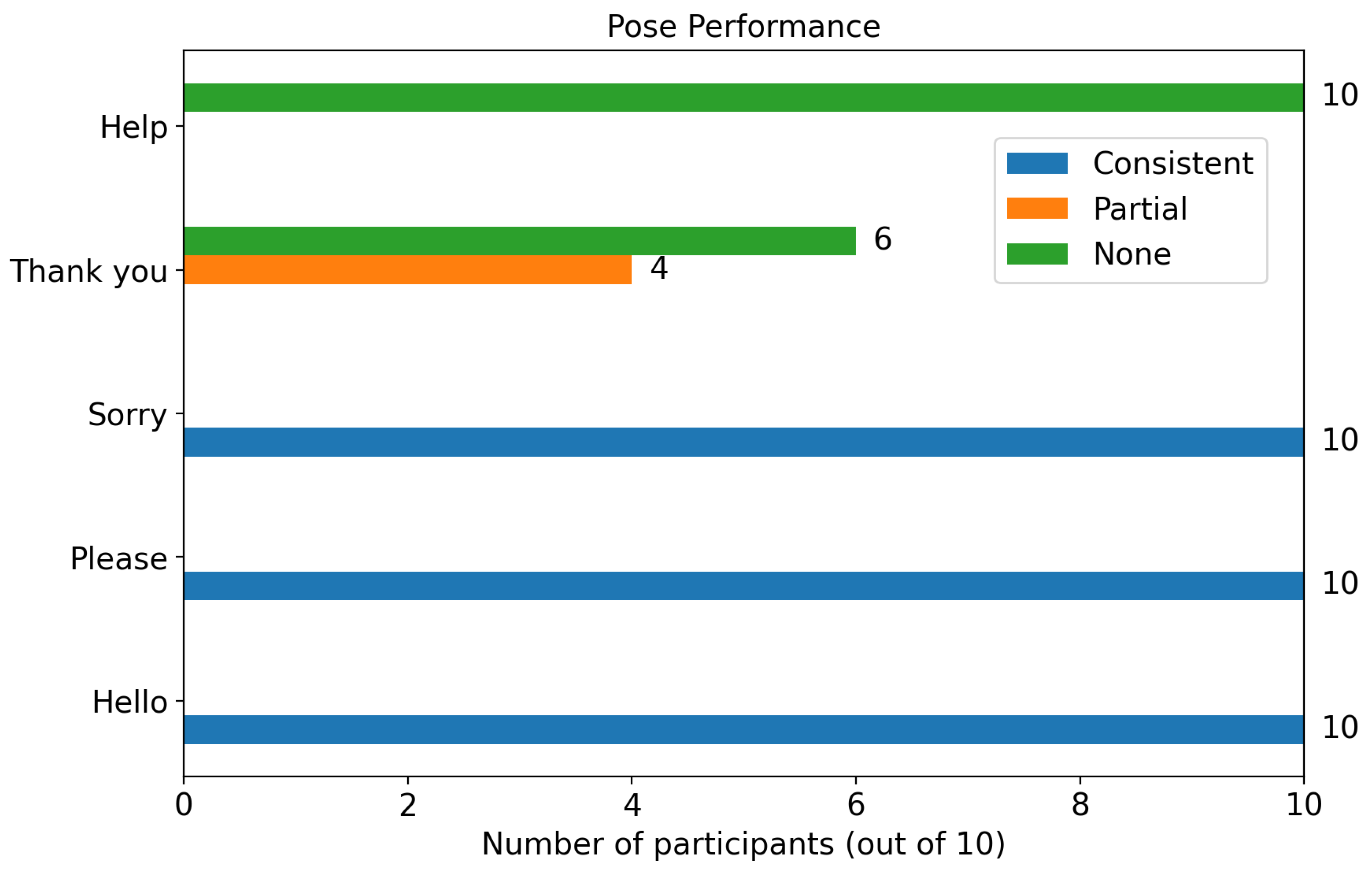Participant performance across five poses. Stacked bars (N = 10) show the count of participants rated Consistent (blue), Partial (orange), or None (green) for each sign.