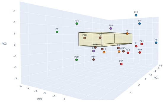 The second stage defines the quality of each platform using the geometric performance method, also known as the “Area-Based Aggregation Method” or “Radar Chart Area Method,” used in the Metagon typology [35]. This consists of representing the quality level of the metaverse platform through a radar chart where each axis corresponds to an evaluated attribute. The score obtained (between 0 and 5) is translated into a vertex of a closed polygon. It is proposed that the surface area of the polygon represents the multidimensional quality of the evaluated platform. The larger the area, the closer it is to the ideal, defined as maturity level 5 (ML5) in the dimensions. While this metric provides a valuable summary of performance, it is sensitive to the arbitrary ordering of axes. Therefore, to prevent classification artifacts derived from axial arrangement, the evaluation model triangulates this geometric indicator in the third stage and compares the platforms using three complementary approaches: k-means Cluster Analysis, Principal Component Analysis (PCA), and the geometric Radar Area method.