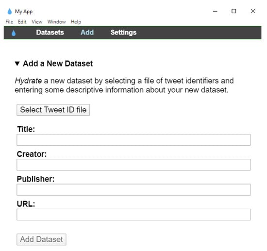 - Click on the “Add” button to add a new dataset comprising only Tweet IDs (Figure 1). Browse and select the file—“Exoskeleton_TweetIDs_Set2.txt” available on local storage.