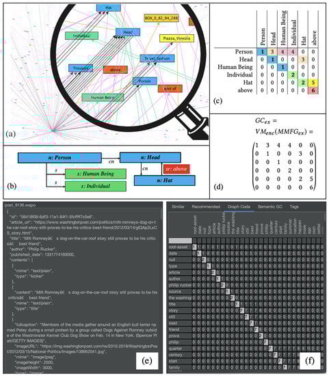 Mutimedia features represented as a graph code index (a–d), example of a graph code index and its matrix visualization for a text document (e,f).