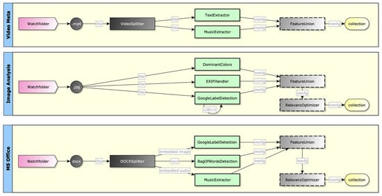 Another important related work is IVIS4BigData [], where an architecture for the visualization of information is presented, which can also serve as an architectural model to process raw data into structured data, and apply analytic algorithms to it. The corresponding information model in the area of multimedia can be represented by the stratification model [], which forms a (optionally time-based) set of different layers that segments the contextual data contained in, for example, a video, into multiple layers called strata. By employing this, feature information of various multimedia layers can also be identified for a certain point of time, e.g., within a video. Such a model can contribute to the modeling of processing flows, which is outlined in Section 3.