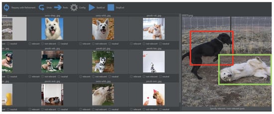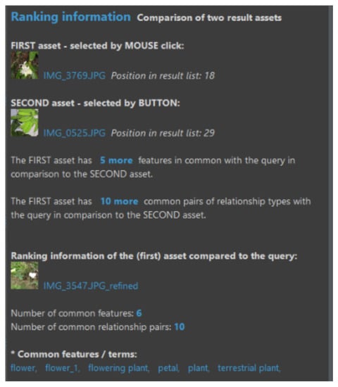Figure 11 already showed the user interface for query refinement. On the right side, sections of a specific image were marked as “relevant” (green bounding box) and “irrelevant” (red bounding box). The results of this refined query are shown in the center of this screenshot and demonstrate that, due to this refinement, now only white (or at least white-ish) dogs remain in the result list, and black dogs were removed automatically. In a second experiment, the textual visualization of MMIR processing steps was evaluated. Figure 17 shows how the results of a GMAF search can now be explained automatically by comparing them to the query and applying the introduced metrics.