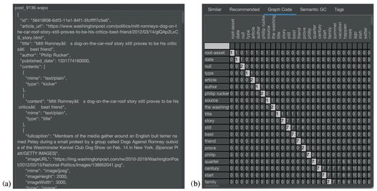 Another area where soundness can support MMIR processes is the area of news and fake news. As a underlying dataset, we selected the text archive of the Washington Post [], which is also part of the reference datasets of the TREC conference [] and contains about 750,000 articles in machine readable JSON-format (see Figure 13a). These articles were processed into graph codes (see Figure 13b).