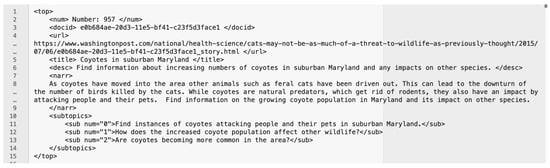 Based on these prerequisites, we conducted two experiments. First, the soundness between two articles in the same topic area is calculated. Second, the soundness parameter is employed to determine contradicting documents within the same topic area. In both cases, it is required to work on articles within a similar topic. It does not make sense to compare sports articles with international politics. As a starting point, we selected an article that has also been employed during the TREC 2021 conference about “Coyotes in Maryland” (see Figure 14).