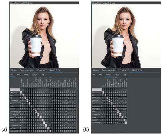 In the area of integration, relevance calculations can be performed by employing feature fusion strategies. To show the improvement of feature fusion, a qualitative experiment was conducted, where the resulting graph codes of images are compared. Figure 15 shows two graph code for the same image. In Figure 15a) the normal graph code is shown, while in Figure 15b), a feature fusion plugin is applied, which removes irrelevant features according to the collection’s content. In this experiment, the collection contains 200 photos of a photo shoot with the same person, same background, same clothing, etc. However only in few photos, the person in the picture presented a coffee cup.