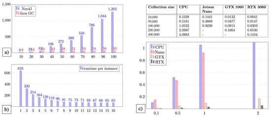 In the area of scalability, several quantitative experiments were conducted to further refine and detail the set of experiments already shown in []. Figure 16 shows the corresponding results. The details of this extended evaluation are given in Table 2 and Table 3 based on the number of input images c, the number of calculated MMFG nodes n, the corresponding edge number e, the Neo4J runtime with (i.e., that Neo4J compares up to three links between nodes for similarity). The and column shows the runtime of the corresponding GMAF implementation. The evaluation of scalability is shown in Table 4 based on n nodes, i GMAF instances, the number a of multimedia objects per instance, and the runtime t for the execution of the experiment. Furthermore, in Table 5, the overall runtime based on the number of physical servers for horizontal scaling and the number of instances per physical sever is evaluated. Finally, Table 6 shows the parallelization (i.e., vertical scaling) based on CPU and GPU implementations of the graph code algorithms.