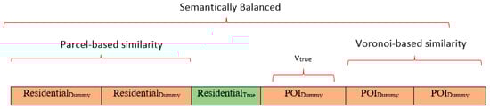 A geographic location is an exact physical place on the Earth’s surface usually represented by a unique latitude and longitude pair. In a majority of the state-of-the-art location privacy studies, the term location is generally used to refer to a geographic location. An adversary can leverage the street address associated with the geographic location to obtain sensitive information about a user [] and, hence, this trick plays an important role in building privacy-preserving mechanisms. An address is generally associated with a parcel of land that has designated property ownership boundaries. When someone refers to a specific geographic location (i.e., longitude, latitude) in an urban setting, it is normally linked to an address that is representative of a land parcel. In other words, any physical location located within a land parcel is associated with a unique address assigned to the land parcel []. Despite the importance of address and land parcels, most dummy-location generation approaches in location privacy assume that a single physical location is enough to represent an address and the underlying land parcel. As a result, these solutions use the physical location as a sole spatial component within their algorithms. In this study, we make use of land parcels rather than single locations to select areas that are similar in a spatial context to the area containing real locations. Applying the land parcels, we can delineate the geographical boundary of a POI location to support the distinction between residential and non-residential locations in the VSBDG algorithm. Without this delineation offered by the land parcel, it is impossible to guarantee that a chosen location is of a certain semantic type—an important requirement for building a semantically balanced dummy location set.